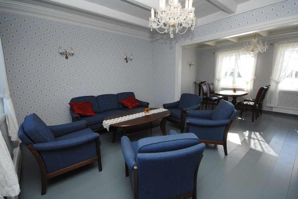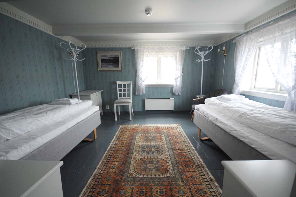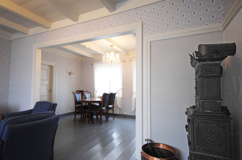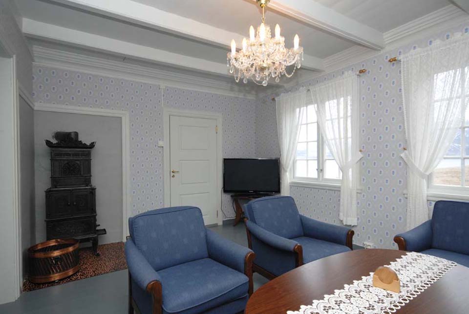 This venerable old building from 1723 was the main building at the trading station, and guesthouse from 1798. The trade ceased in 1914, and then the building was used as a farmhouse. After exterior renovation in the 1990s and full interior renovation in 2013, the building was brought back to 1800s grandeur with wallpapers and color scheme of that time. The kitchen is however modern and well equipped, with up to 14 dining seats. Two bathrooms with toilet and an additional toilet are also in accordance with current standards. The house has four double and three single bedrooms, and in the two largest rooms there are space for an extra guest. The house has thus capacity for 11 + 2 overnight guests. The living room has TV with Norwegian and German channels and blue-ray player. Wireless internet access is available. See also the picture gallery for presentation of the building and the rooms. For booking, look at the top of this page.