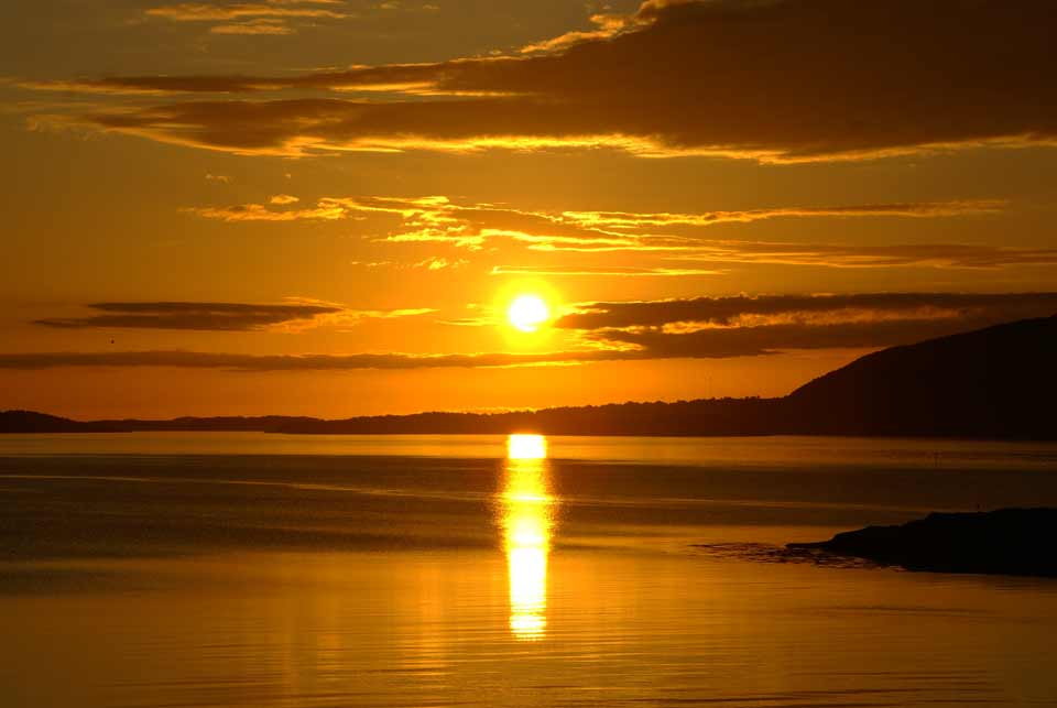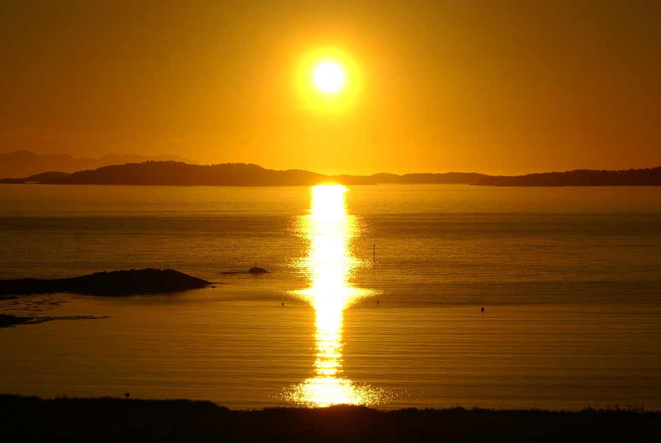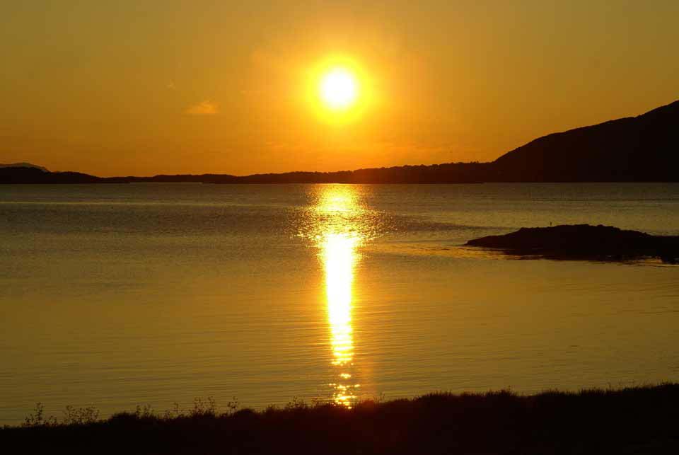 From Elgsnes the midnight sun looks especially great since the sunbeams are reflecting from the sea across Toppsundet. On fine midnight sun evenings, many people arrive here to look at the sun and the colors of the sky and the fjord. The midnight sun is above the horizon from May 22nd to July 21st here in Elgsnes, but if you calculate according to summertime instead of when the sun is on it's lowest point, the sun is visible already at midnight on 20th May.